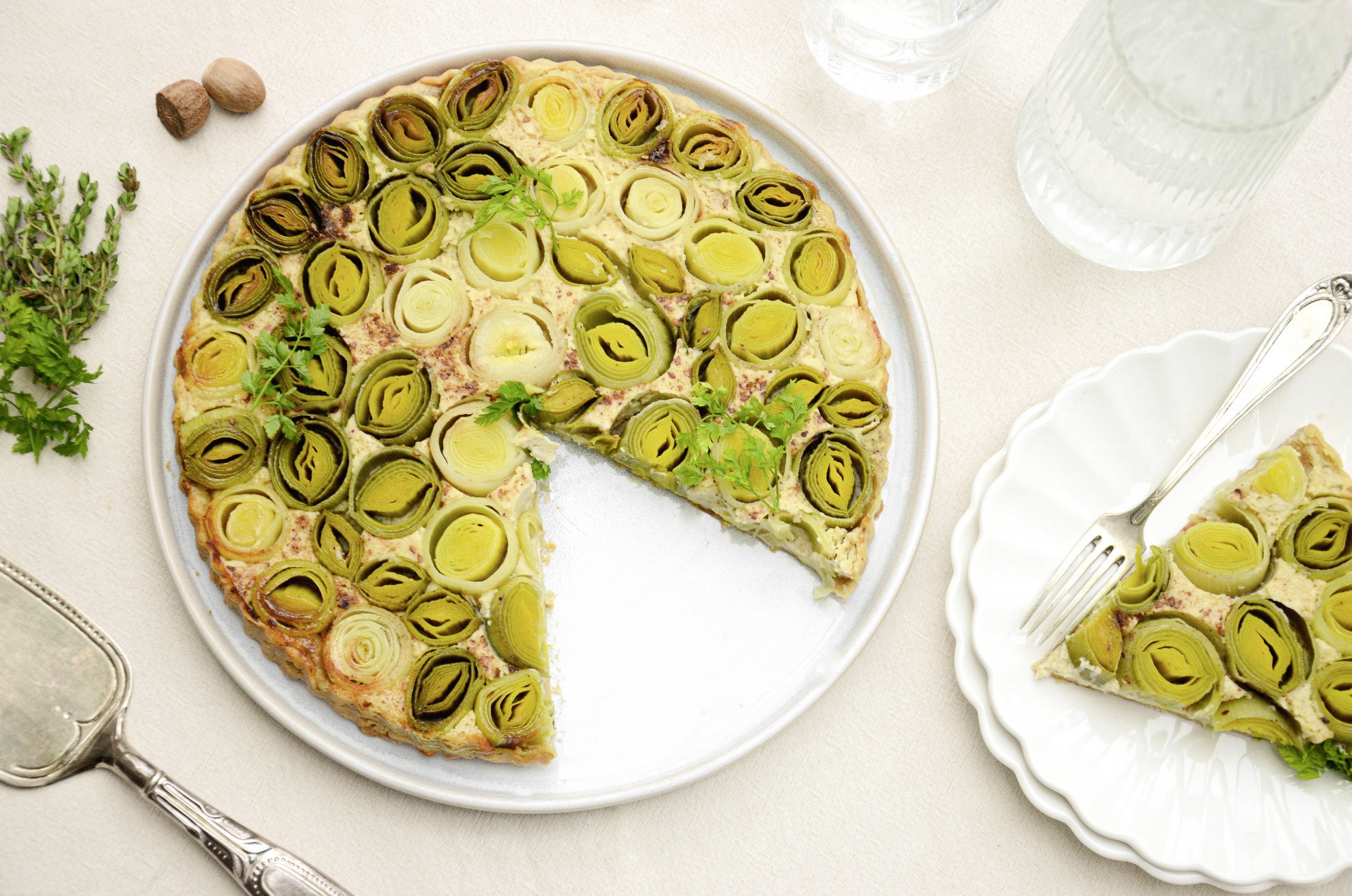 Prima di tutto l’aspetto. Tagliato a fette, il porro ha un’ottima resa estetica. La cottura lenta, inoltre, ne esalta il sapore ricco e leggermente dolciastro, che si sposa perfettamente con la tarte tatin.