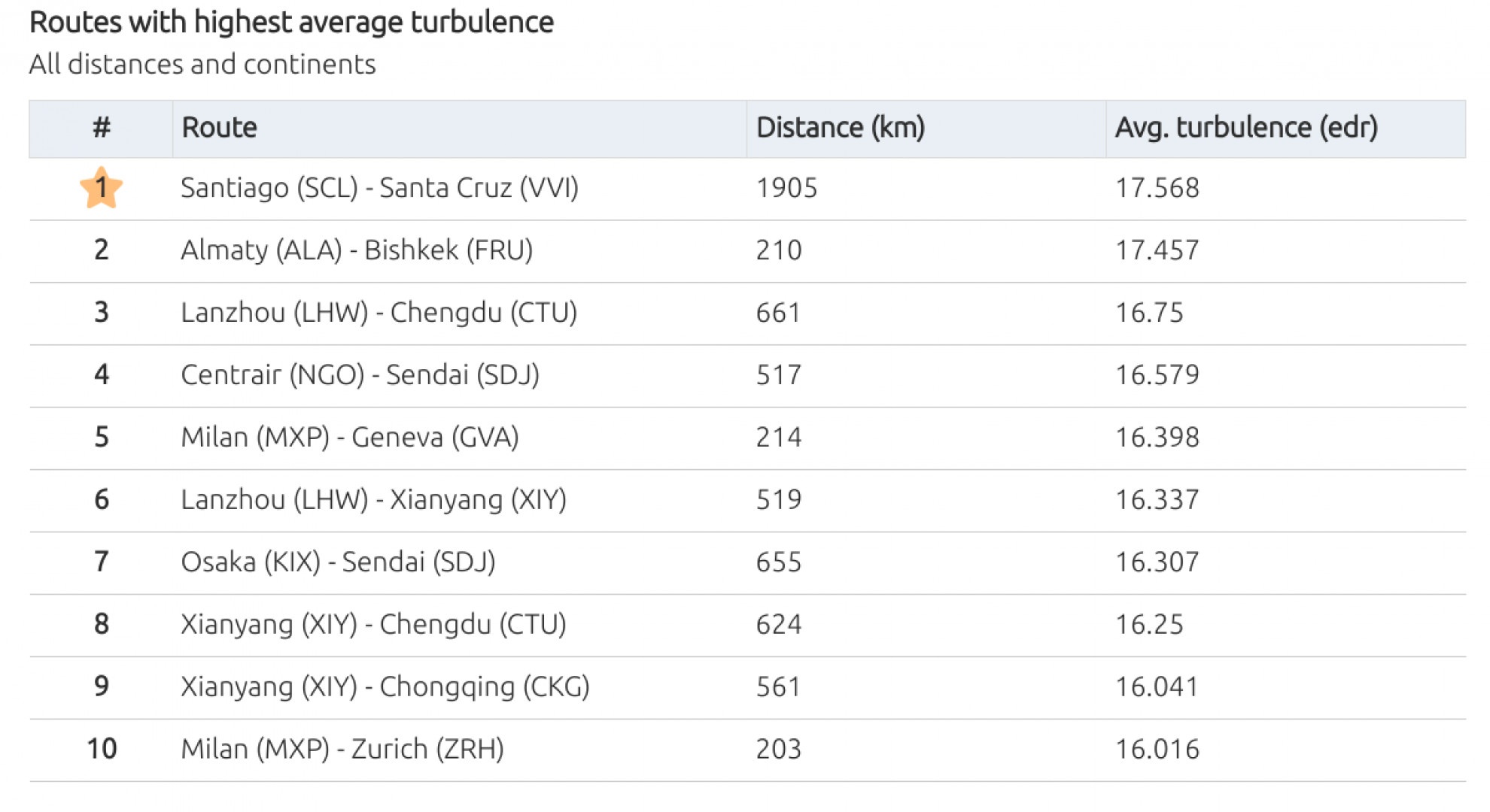A livello europeo, le tratte verso gli aeroporti svizzeri si confermano le più difficoltose, tanto è vero che occupano quasi tutta la classifica. L'entità delle turbolenze sono sempre considerate leggere.