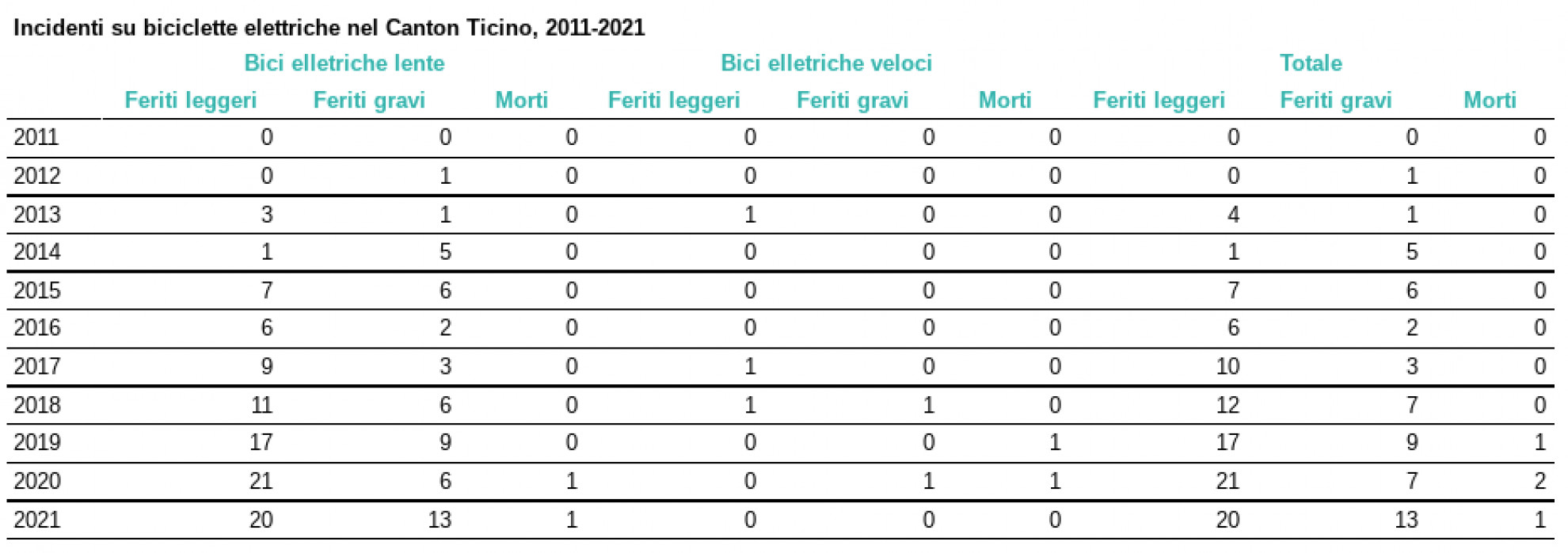 Fa la differenza, nel computo, l’aumento dei mezzi elettrici: nel Cantone, secondo i dati forniti dall’UPI, negli ultimi 10 anni sono stati 156 gli incidenti, quasi tutti successi a persone a bordo di bici elettriche “lente”: di questi, 54 hanno causato ferimenti gravi. Sono 4, invece, i decessi (qui alcuni consigli per l’utilizzo dei mezzi).